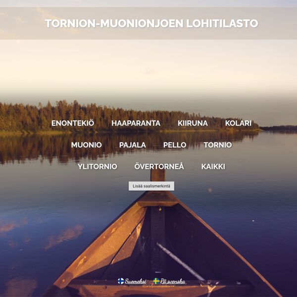 Tornion-Muonionjoen lohitilastoTällä sivustolla voit ilmoittaa lohisaaliisi. Astu sisään sivustolle, klikkaa kuntaa jonka alueelta olet saalista saanut.