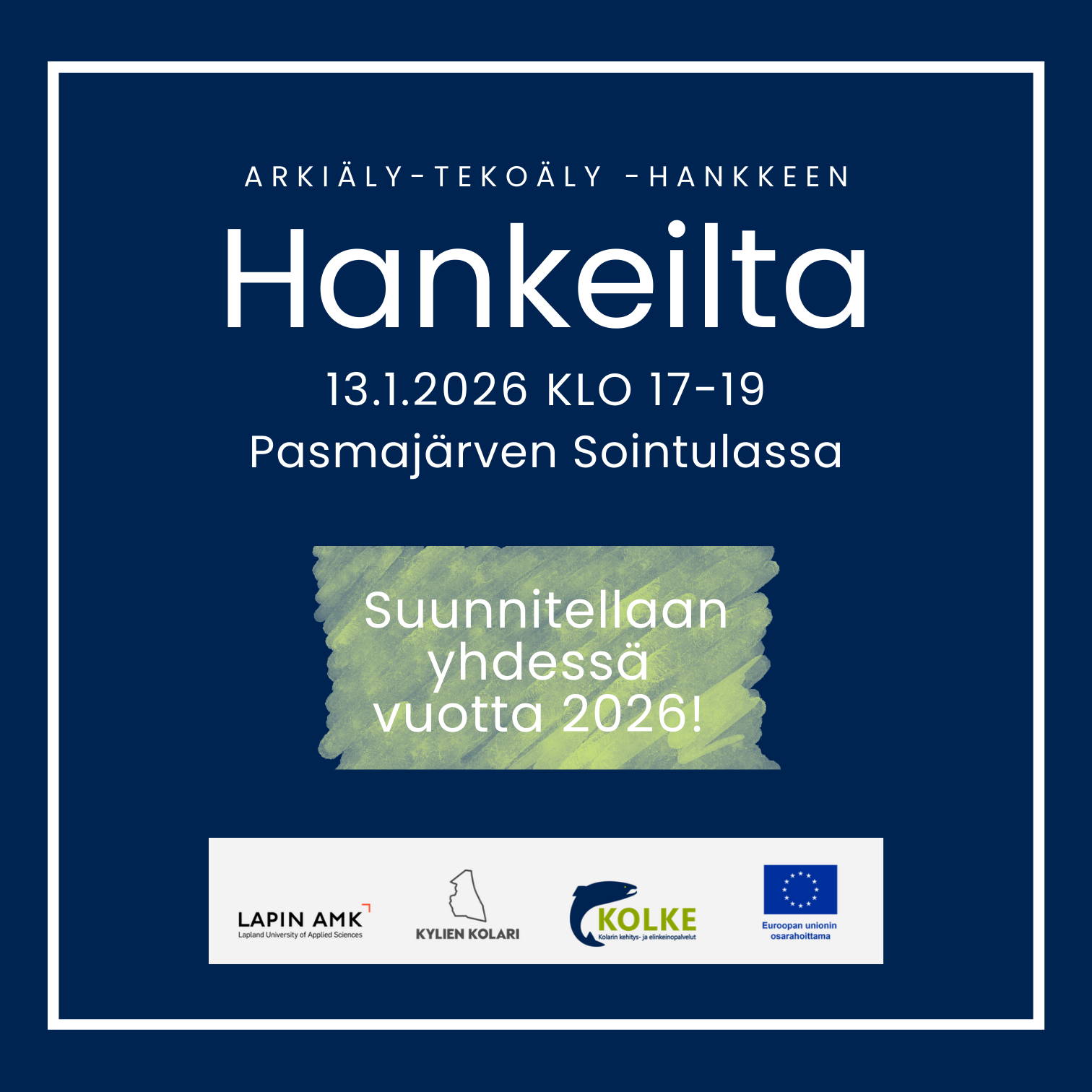 Nuottavaarantie 55, 95860 PasmajärviTervetuloa kaikille avoimeen Arkiäly-Tekoäly -hankkeen hankeiltaan Pasmajärven Sointulaan tiistaina 13.1.2026 kello 17.00 –19.00. Illan tarkoituksena on suunnitella alkanutta vuotta, kun hankeaikaa on jäljellä reilu puoli vuotta. Onko kyläläisillä toiveita tai ehdotuksia hankkeelle? Edistetäänkö opiskelijoiden ehdotuksia vaikuttajamatkasta järvikyliin? Mitä ajatuksia monilla paikkakunnilla käyttöönotettu kyläradio herättää? Onko kaikki hyvin sydäniskureiden kanssa? Keskustellaan ainakin näistä!