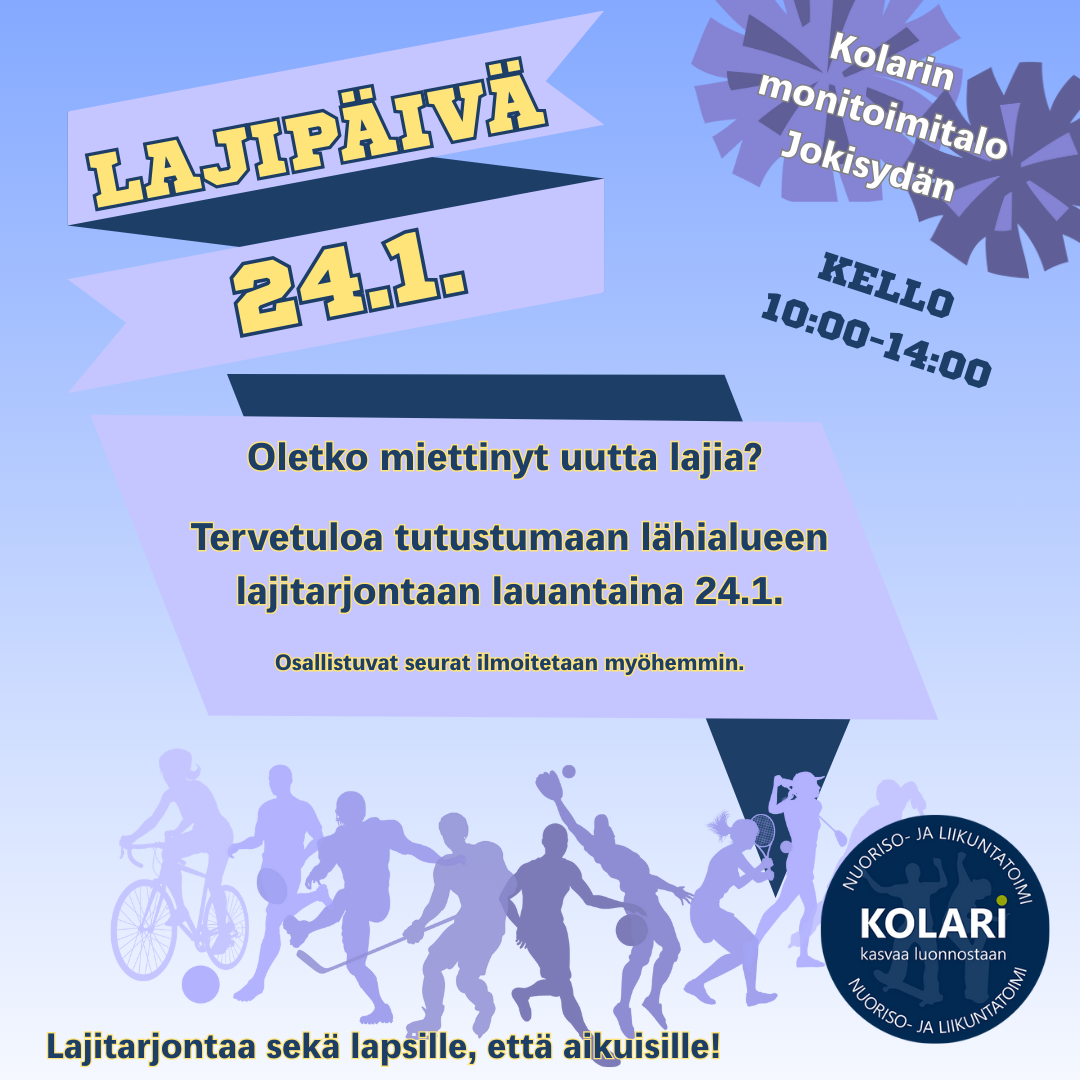 Jokijalantie 18, 95900 KolariLajipäivä tarjoaa mahdollisuuden löytää itselle uusi laji, olit sitten aikuinen tai lapsi. Jokisydämen molemmat liikuntasalit on varattu kello 10.00-14.00 erilaisille seuroille ja harrastusmahdollisuuksien esittelijöille Kolarissa ja lähiseuduilla. Tervetuloa tutkailemaan, kyselemään ja kokeilemaan uusia lajeja yksin tai yhdessä!