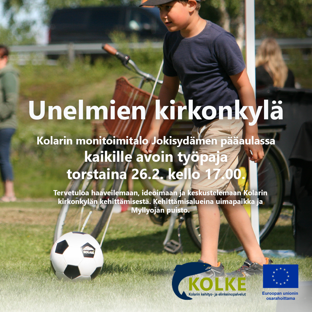 Kaikille avoin työpaja järjestetään torstaina 26.2. kello 17.00 – 19.00 Kolarin monitoimitalo Jokisydämen pääaulassa. Sisään pääsee pääovesta. Ennakkoilmoittautumista ei tarvita. Paikalla on kahvitarjoilu.